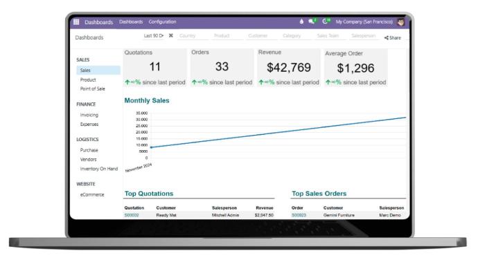 Puedes analizar datos relacionados con ventas, finanzas, inventario, marketing, y más, todo desde un entorno centralizado y personalizable.